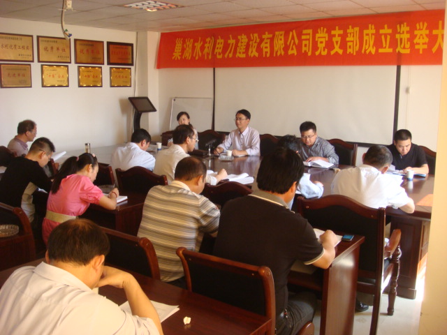 根據《中國共產黨章程》規定和《中華人民共和國公司法》第十九條要求,在公司設立中國共產黨的組織,開展黨的活動。經中共巢湖市鳳凰山街道辦事處工作委員會2013年32號文批復,巢湖水利電力建設有限公司于2013年5月28日正式成立巢湖水利電力建設有限公司黨支部,2013年6月3日在本公司六樓會議室召開了黨員大會,到會黨員16名,在鳳凰山街道工委負責同志的指導和監督下,采取了差額和無記名投票的方式,經支部黨員大會選舉并報經中共巢湖市鳳凰山街道2013年34號文批復,由宋國華、劉來發、李良潤、李業中、王平組成中共巢湖市巢湖水利電力建設有限公司支部委員會。