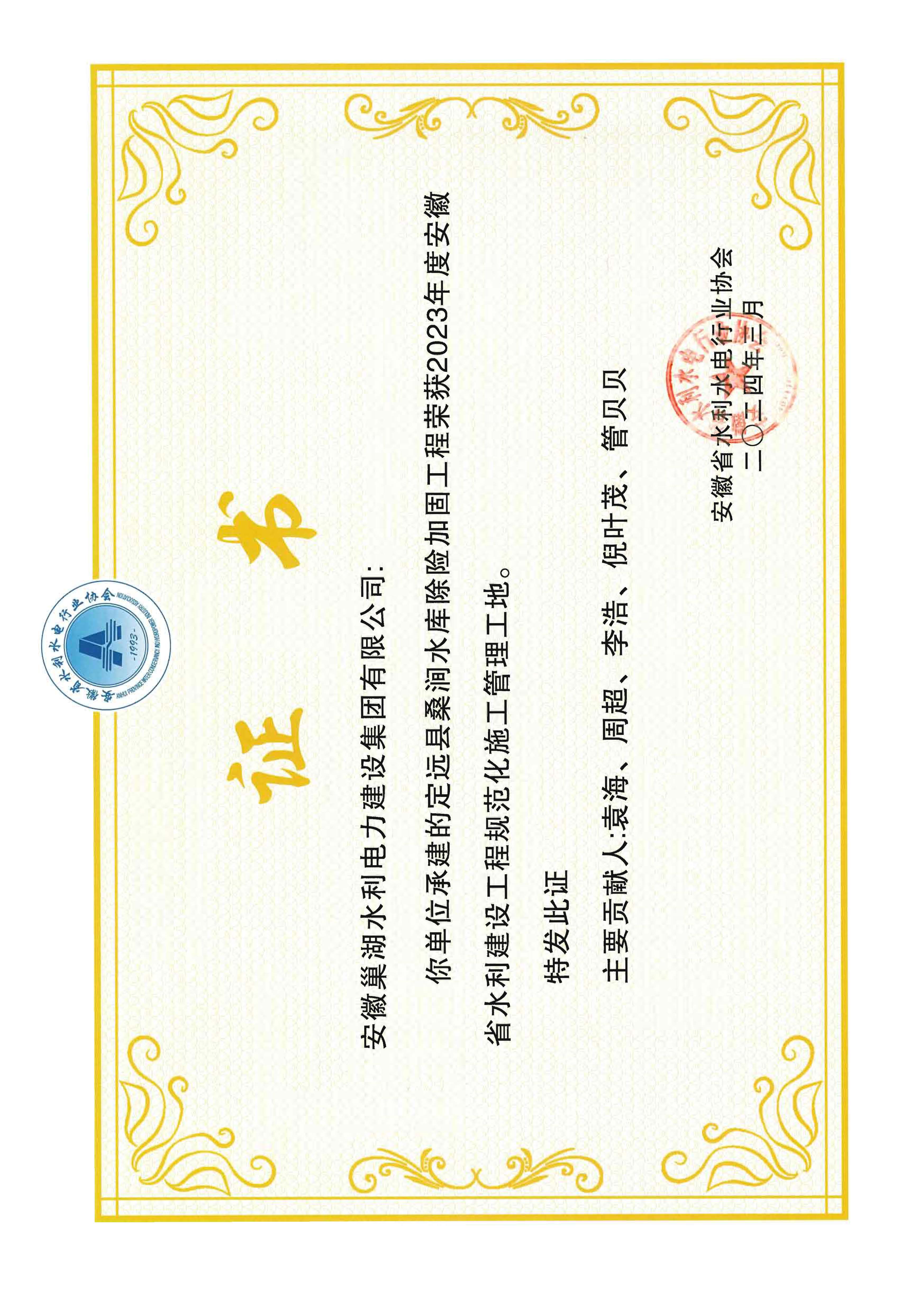 2023年度安徽省水利建設(shè)工程規(guī)范化施工管理工地獲獎證書