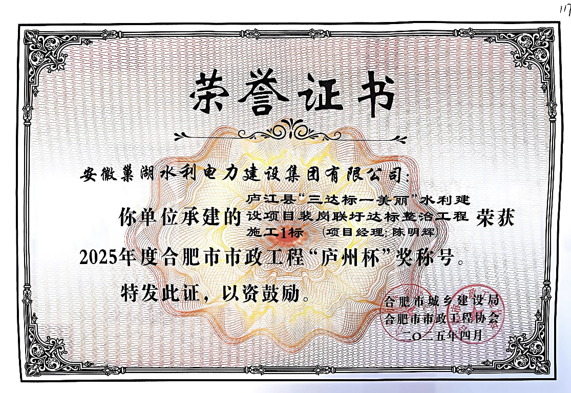 廬江縣“三達標一美麗”水利建設項目裴崗聯圩達標整治工程施工1標榮獲“廬州杯”證書