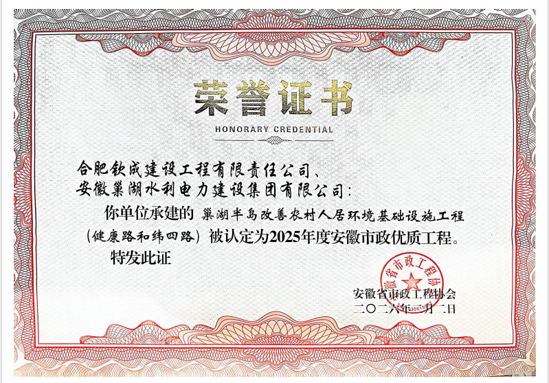 巢湖半島改善農(nóng)村人居環(huán)境基礎(chǔ)設(shè)施工程(健康路和緯四路)施工榮獲2025年度安徽市政優(yōu)質(zhì)工程獎